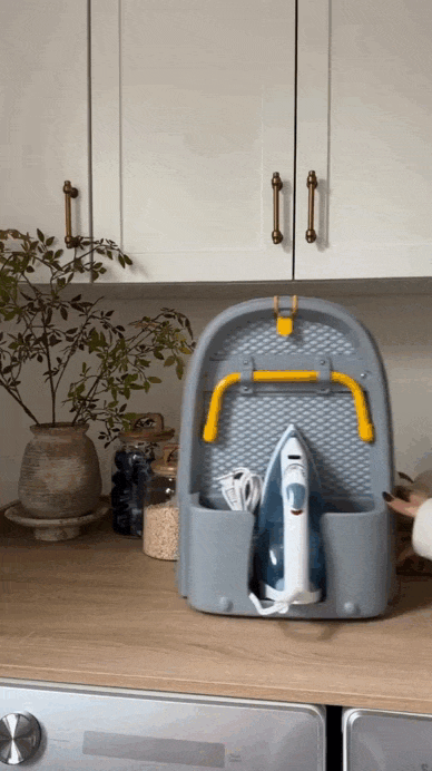 Hält Bügelutensilien ordentlich, aufgeräumt und griffbereit.